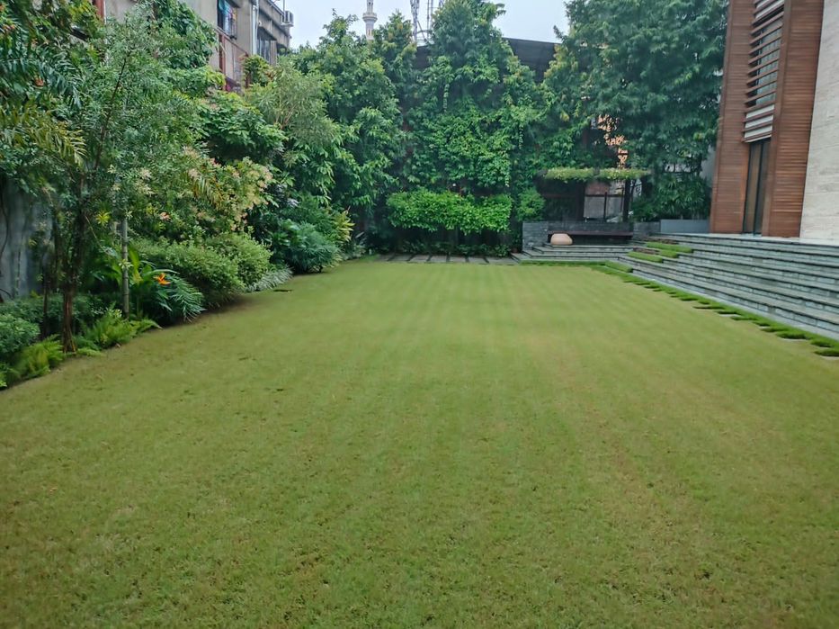 A flight of steps descends into the formal garden from the house. Strips of green cuts the linearity of the steps.